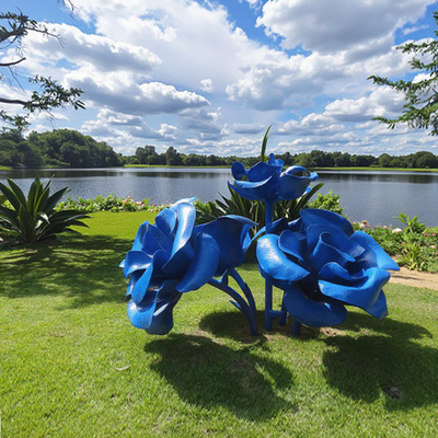 이 대형 페인팅된 파란색 꽃 장미 조각품은 예술과 자연의 놀라운 조화입니다. 정원 호숫가에 배치되어 푸른 잔디와 잔잔한 물을 배경으로 생생하게 돋보입니다. 밝은 파란색 색상은 환상과 생동감을 더하여 정원을 예술적인 안식처로 만들고, 사람들이 예술과 자연 환경의 아름다움을 모두 감상할 수 있게 합니다..