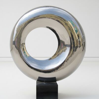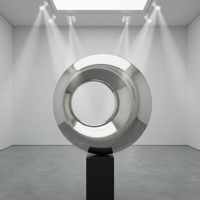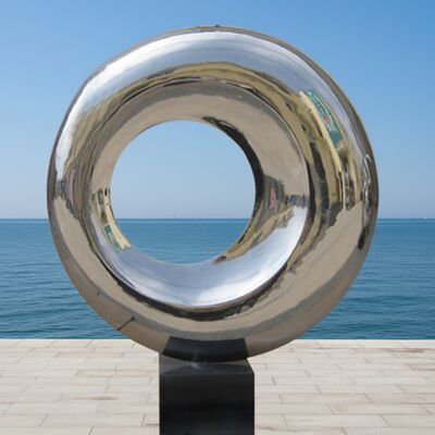 이 스테인레스 스틸 현대 미술 작품은 빛과 주변을 포착하는 반짝이는 거울 표면을 갖추고 있으며 추상적인 원형 형태를 현대 공간의 역동적인 초점으로 만듭니다.
