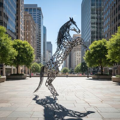 This striking outdoor stainless steel art statue features a dynamic rearing horse crafted from interlocking metal rings. Perfect for lawns, patios, or estate landscapes, its reflective surface catches sunlight beautifully against trees and greenery. A bold statement piece that blends modern design with nature’s elegance.e.